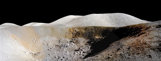 Panorama of Shorty Crater, Station 4, assembled from seven color-balanced frames taken by Gene Cernan on the east end of the south rim. Note the red streak on the interior crater wall at left, the long black ash streak left of center, and the two red splotches and black splotches below the rim boulder on the far wall at ~110 m distance. These features will be discussed in more detail in Section 2. (Derivative composite of NASA photos AS17-137-21005, -21000, -21001, -21002, -21003, -21004, and -21024. Copyright © 2018 by Tranquillity Enterprises, s.p. Courtesy of Tranquillity Enterprises, s.p.1).