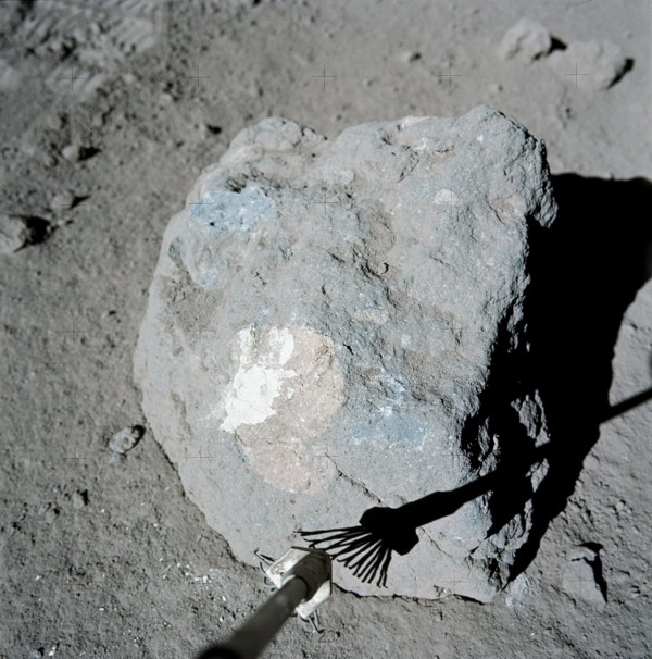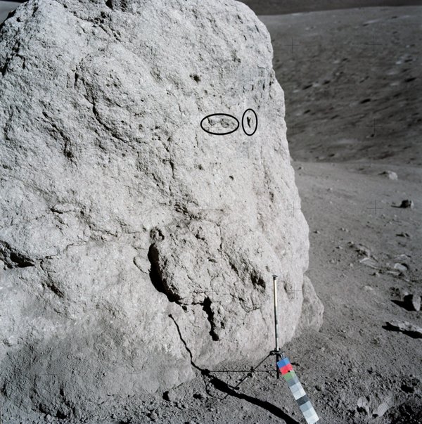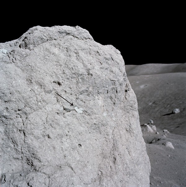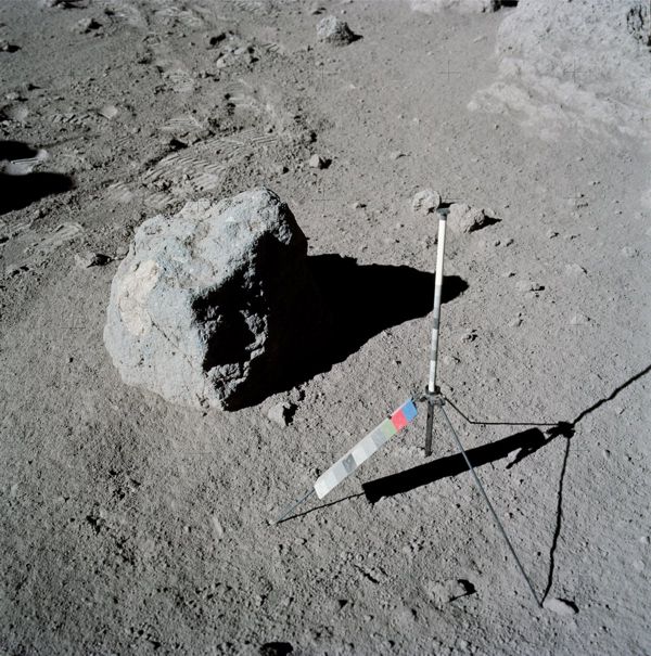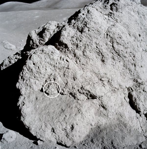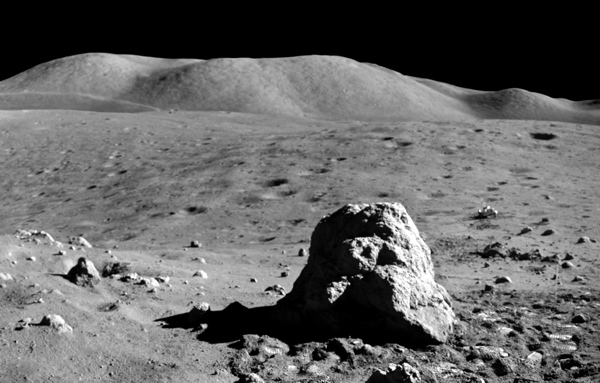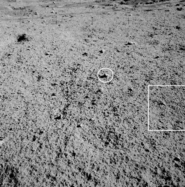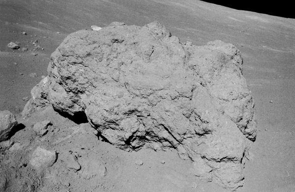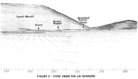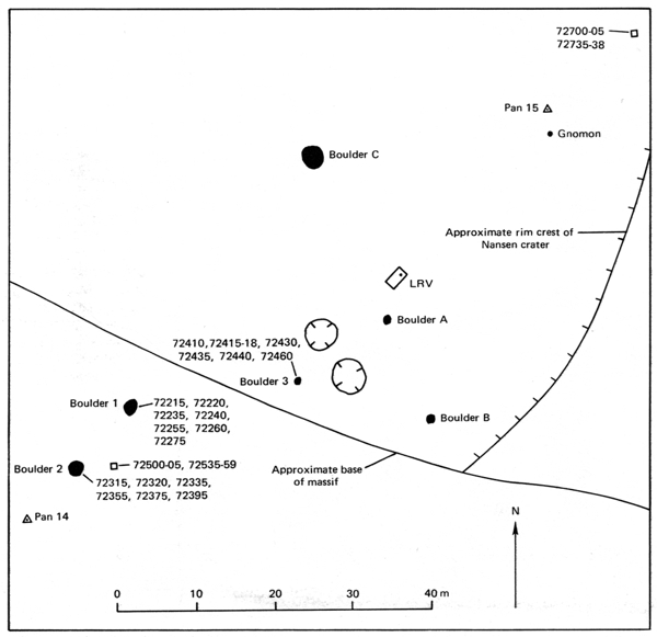 “Well, let’s see,” I said, looking around. “You know, that big block up there [on Lara Crater’s flank] might be worth going to.” This block would have been too large to have been covered by the light mantle avalanche; however, it probably would be a block of mare basalt and not as important as getting samples of rocks in the light mantle that would give a more statistical sample of the South Massif. I am glad that this suggestion was ignored.